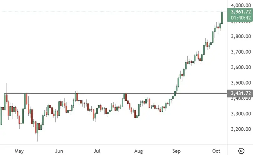 The price of XAUUSD has moved rapidly from a test of the $3,500 level to come close to testing $4,200. That is possible this week as momentum continues.