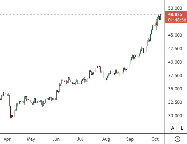 XAGUSD has surged from levels below $40.00 at the start of September for a rapid move to $50.00. Although we have seen selling arrive here, investors should remain on guard for a breakout to higher levels.